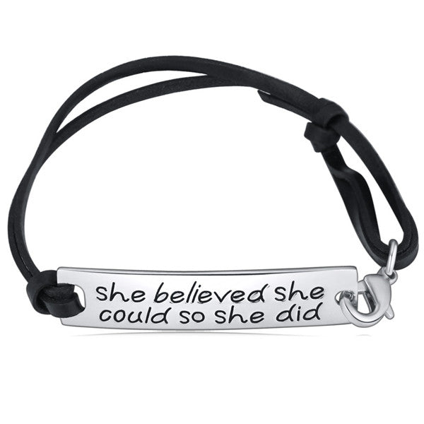 This simple yet classic silver plate bracelet is the perfect symbol for the remarkable things we ladies are capable of! Gift this precious piece to someone who inspires you - or why not treat yourself! The words engraved "She believed she could so she did" is an excellent motivator to dream big! Make a statement with this bracelet by staying bold and looking classy!