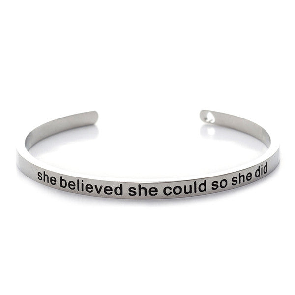 This classic "She believed she could so she did" silver plated bracelet is the perfect way to symbolize all the amazing things us ladies are capable of! This bangle is the perfect gift for that special lady who inspires you or the perfect gift to treat yourself! Make a statement with this bracelet by representing how powerful women are.